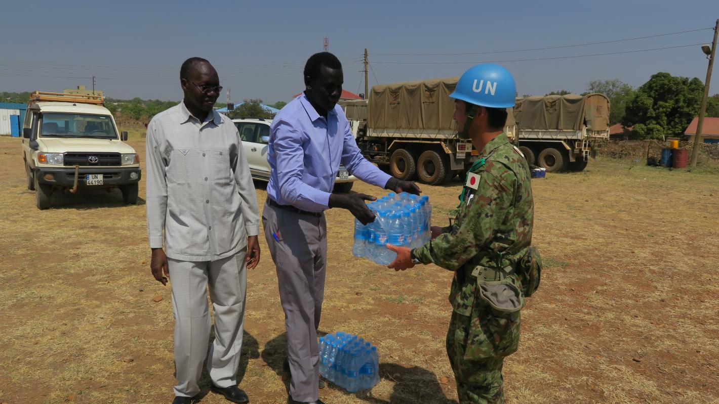 UNMISS Japanese Peacekeeping Engineers accepting water from the Leadership of the University of Juba as they level the University's football pitch.