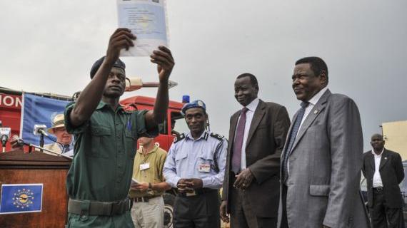 South Sudan National Police Service officer holding graduation certificate from UNMISS-assisted aviation security course at Juba International Airport on 3 June. The week-long course was one of several trainings UN Police has assisted SSNPS with over the past few months (see story "SSNPS add airport security to growing skills"). Photo: UNMISS/Isaac Billy. Click for larger image.