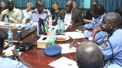 Deputy Special Representative of the Secretary General Raisedon Zenenga, UN Police Commissioner Fred Yiga and UNMISS Human Rights Director Ibrahim Wani meeting South Sudan National Police Service leadership in Juba to explain the mission’s new mandate. Photo: UNMISS/Tian Shen