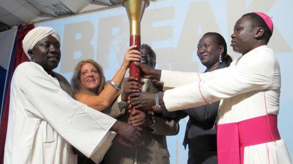 Government ministers, UNMISS chief Hilde F. Johnson and religious leaders holding up torch to launch national campaign against sexual exploitation and abuse in Juba on 27 November. Photo: UNMISS/Christine Spencer
