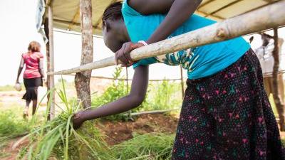 Displaced girl building family shelter at Juba UN House protection of civilians area after arriving from UNMISS Tomping base during ongoing relocation exercise. Photo: UNMISS/JC Mcilwaine
