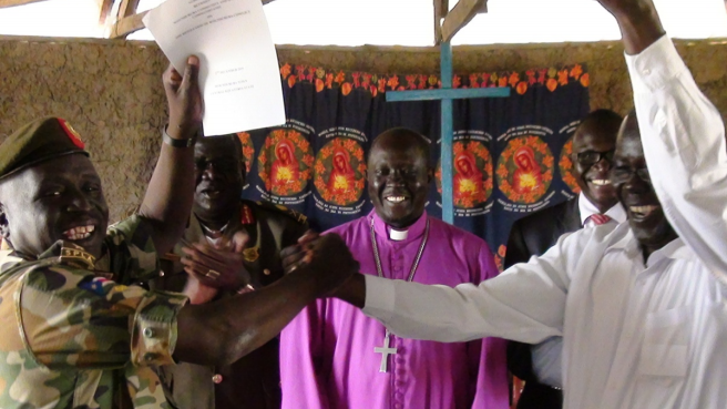 Bishop Paul Yogusuk urges leaders and citizens to unite as a nation. Photo from 8 December 2015, on the celebration of the Wonduruba agreement between local communities and an SPLA unit in the area. Photo: Radio Tamazuj