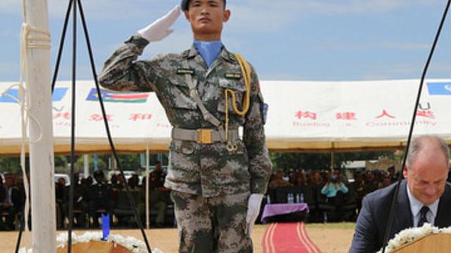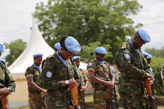 A pair of Nepalese and Rwandan peacekeepers stand together, solemnly playing brass trumpets. Ethiopian peacekeepers hoist the UN and South Sudanese flags; Rwandan peacekeepers hold a military parade, as Chinese troops help with the wreath-laying ceremony in honour of 55 fallen troops – both in line of duty and from illness – who have died since the establishment of the United Nations Mission in South Sudan (UNMISS).