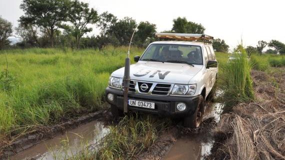 UN Police struggling with road during rainyseason as they carry out their duties near Torit, Eastern Equatoria State. Photo: UNMISS/Thomas Haase. Click for larger image