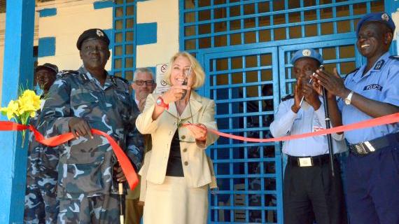 UN Mine Action Service (UNMAS) Director Agnes Marcaillou cutting a ribbon to inaugurate an armoury in Juba on 19 September. UNMAS, in partnership with the Mines Advisory Group, refurbished the armoury at the Central Equatoria Police Headquarters as one of several new projects aimed at boosting the safety and security of the South Sudanese people. Over the next 12 months UNMAS, with support from UN Police, will train South Sudan National Police Service (SSNPS) officers to safely dispose of conventional munitions and to form a sustainable and readily deployable mine action capacity within the SSNPS. Photo: UNMAS / Yumiko Yoshioka. Click for larger image.