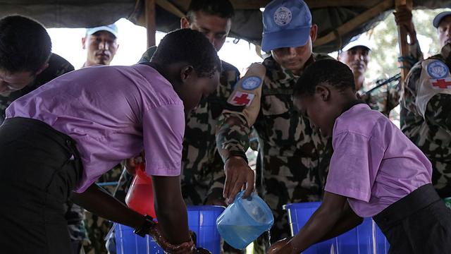 At a school in Juba, hundreds of pupils gather together, curiously listening and mimicking the actions of Nepalese military medics, as they demonstrate proper hand-washing and hygiene techniques.