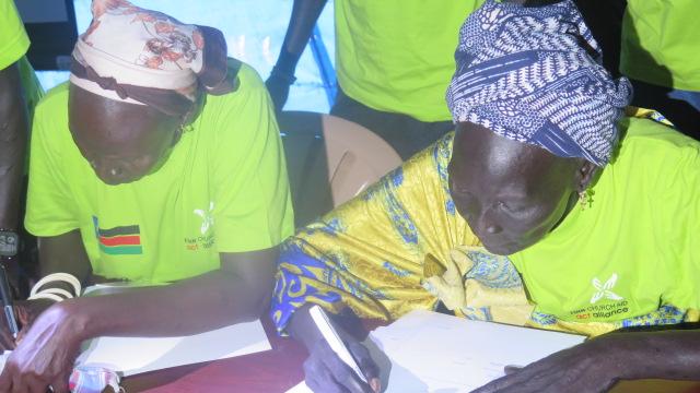 Participants in the peace process signing the peace agreement between Murle and Dinka communities.