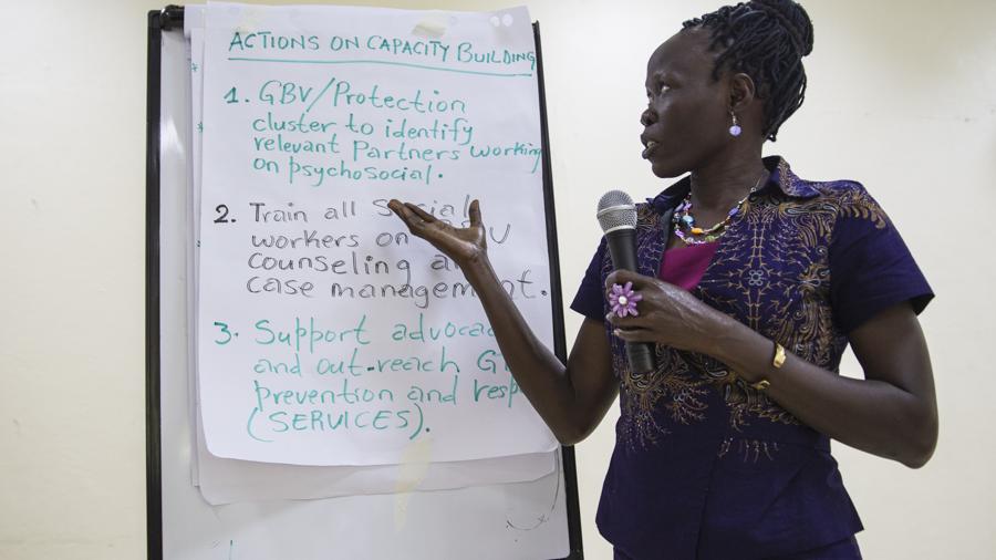 To enhance protection for survivors of gender-based violence (GBV) in South Sudan, a workshop was held with participants from all 10 states in Juba on 21 August. Participants shared legal, health, psycho-social and safety challenges they faced in tackling GBV, which will form the basis of draft guidelines for care of survivors. Organized and funded by the UN Population Fund, the activity was also supported by UNMISS, UNICEF and the International Rescue Committee. Photo: UNMISS/Martine Perret. Click for larger image
