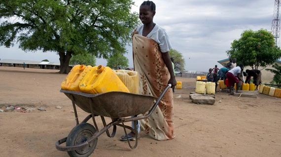 Woman transporting water to her home in Juba, South Sudan, as the world celebrates World Water Day on 22 March. Only about 25 per cent of the country's population enjoys access to safe drinking water. Millions of people must trek miles every day to collect water from ponds, marshes, ditches or hand-dug wells. Photo: UNMISS/Isaac Billy. Click for larger image