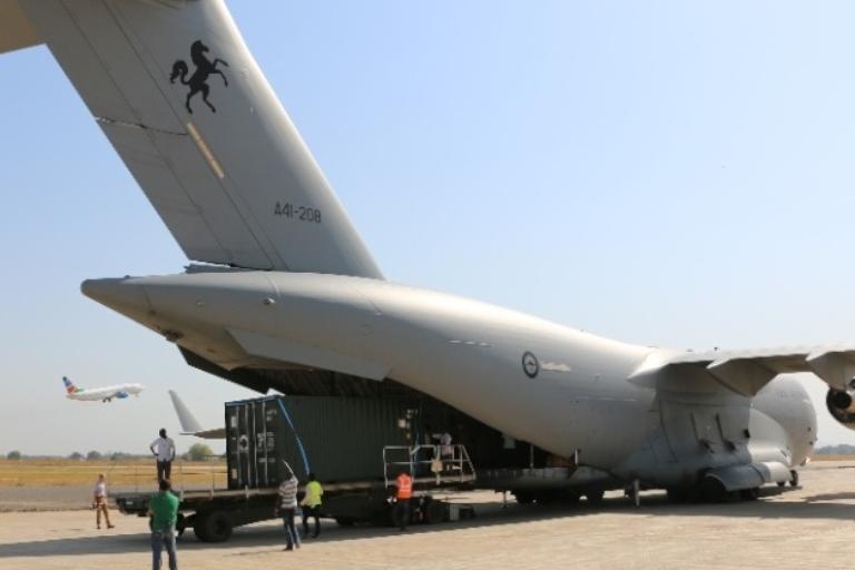 UNMISS staff off-loading materials to fortify its bases in South Sudan, where thousands of civilians have sought shelter. The supplies were flown into Juba from Italy on an Air Force C-17 aircraft provided by the Australian…