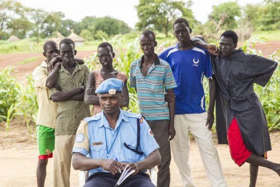 United Nations Police (UNPOL) officer on co-location patrol in Kwajok, Warrap State. UNPOLs assist in improving South Sudan National Police Service (SSNPS) skills down to the county level through on-the-job training…