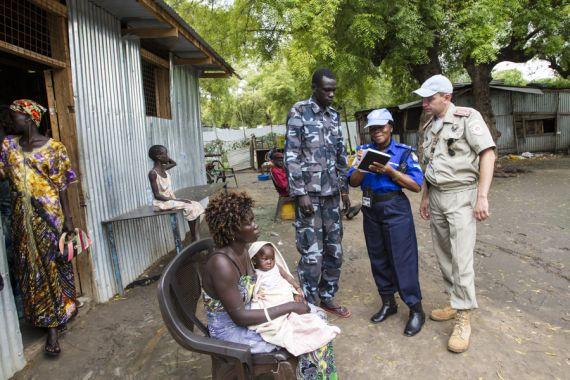 UN Police officers Dorah Conteh (Sierra Leone) and Yurii Marenko (Ukraine) during daily co-location visit to police station in Bor, Jonglei State. They monitor detainees' offences and length of prison stay as well as advise…