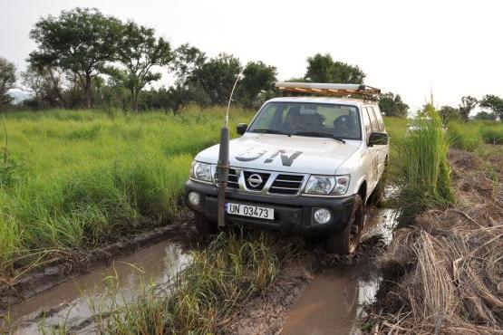 UN Police struggling with road during rainyseason as they carry out their duties near Torit, Eastern Equatoria State. Photo: UNMISS/Thomas Haase. Click for larger image