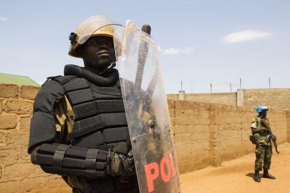 UN peacekeepers and South Sudanese police officers provide security during visit of UN Assistant Secretary General for Rule of Law and Security Institutions Dmitry Titov to Torit prison on 19 April 2013. Photo: UNMISS/Martine…