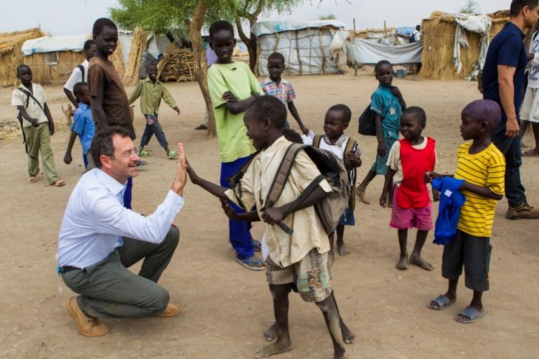 Deputy Special Representative of the Secretary-General and Humanitarian Coordinator Toby Lanzer speaking with children in Nyeel Refugee Camp, Unity State. According to the UN Refugee Agency, more than half of 70,000 refugees…