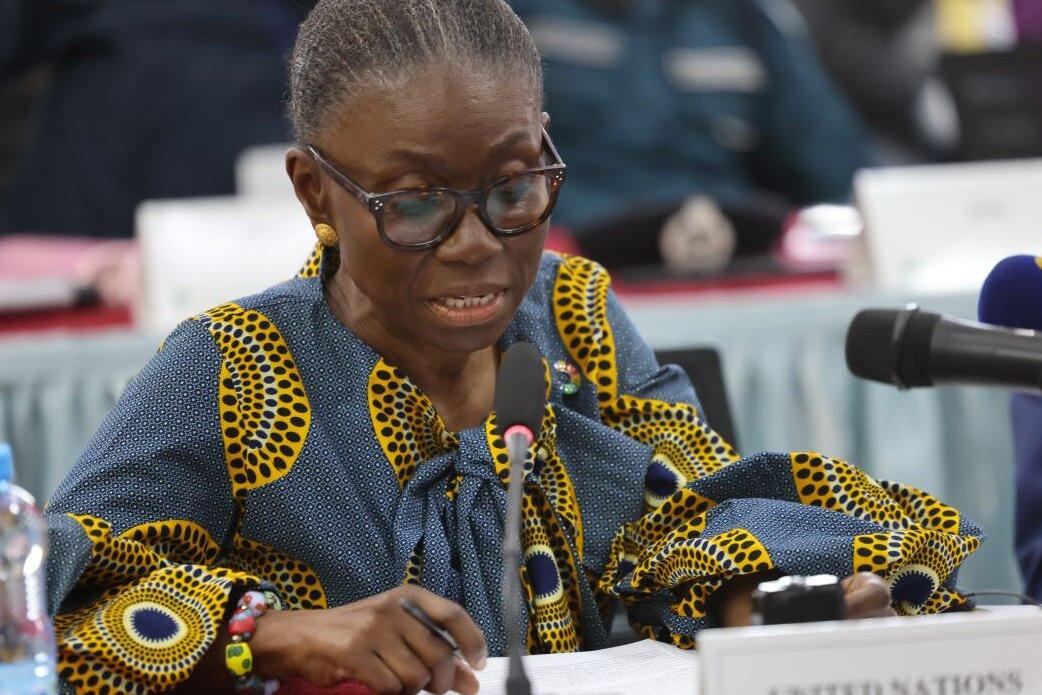 Ms. Anita Kiki Gbeho, Officer in Charge, SRSG and DSRSG-Resident/Humanitarian Coordinator seated at a conference table speaking into a microphone, wearing a patterned blue and yellow outfit, with documents and water bottle on the table.