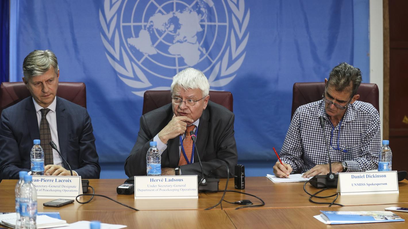 Hervé Ladsous (in the middle), Under Secretary-General for Peacekeeping Operations, at today's press briefing in Juba, South Sudan.